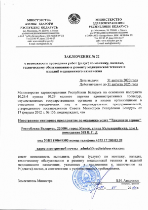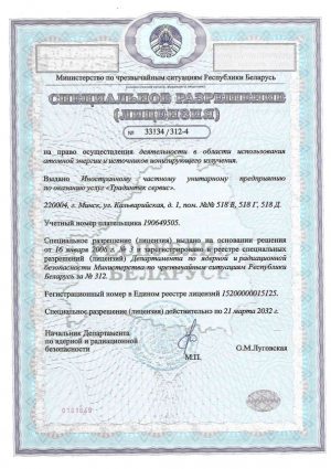 Компания располагает всеми необходимыми лицензиями и разрешениями для проведения работ, выданными Министерством здравоохранения и Министерством по чрезвычайным ситуациям Республики Беларусь.